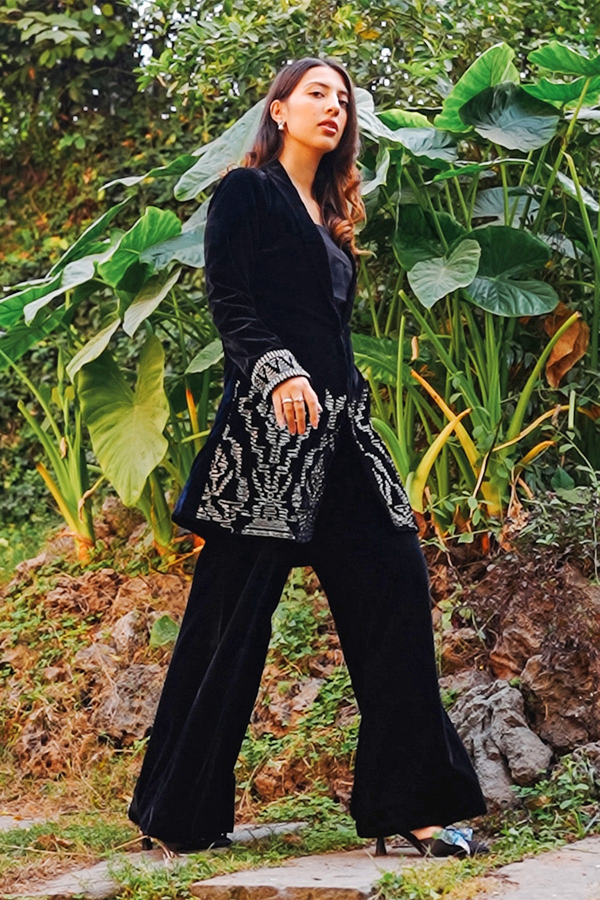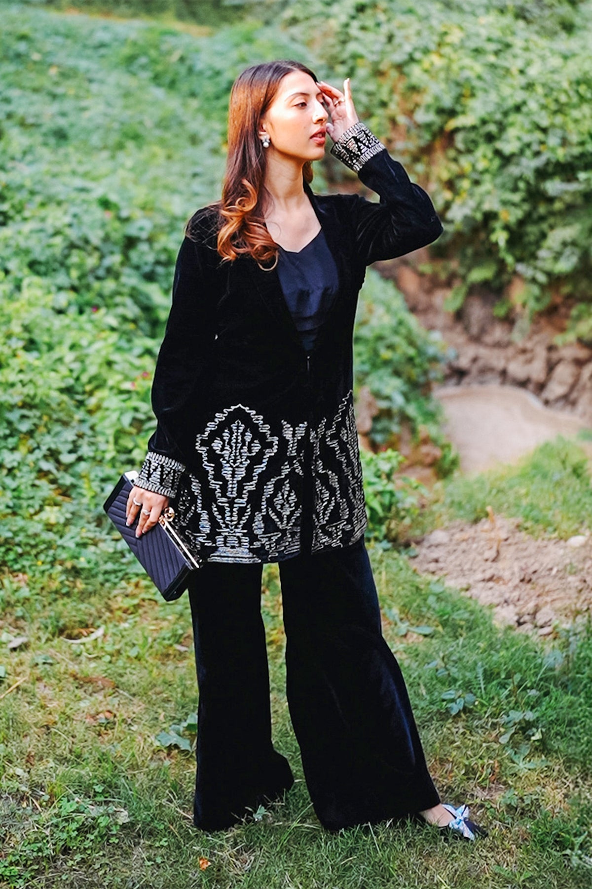 A statement black velvet ensemble featuring intricate silver embroidery along the hem and sleeves bold yet refined. Finished with a graceful silhouette, this look is perfect for evening festivities and winter wedding gatherings
